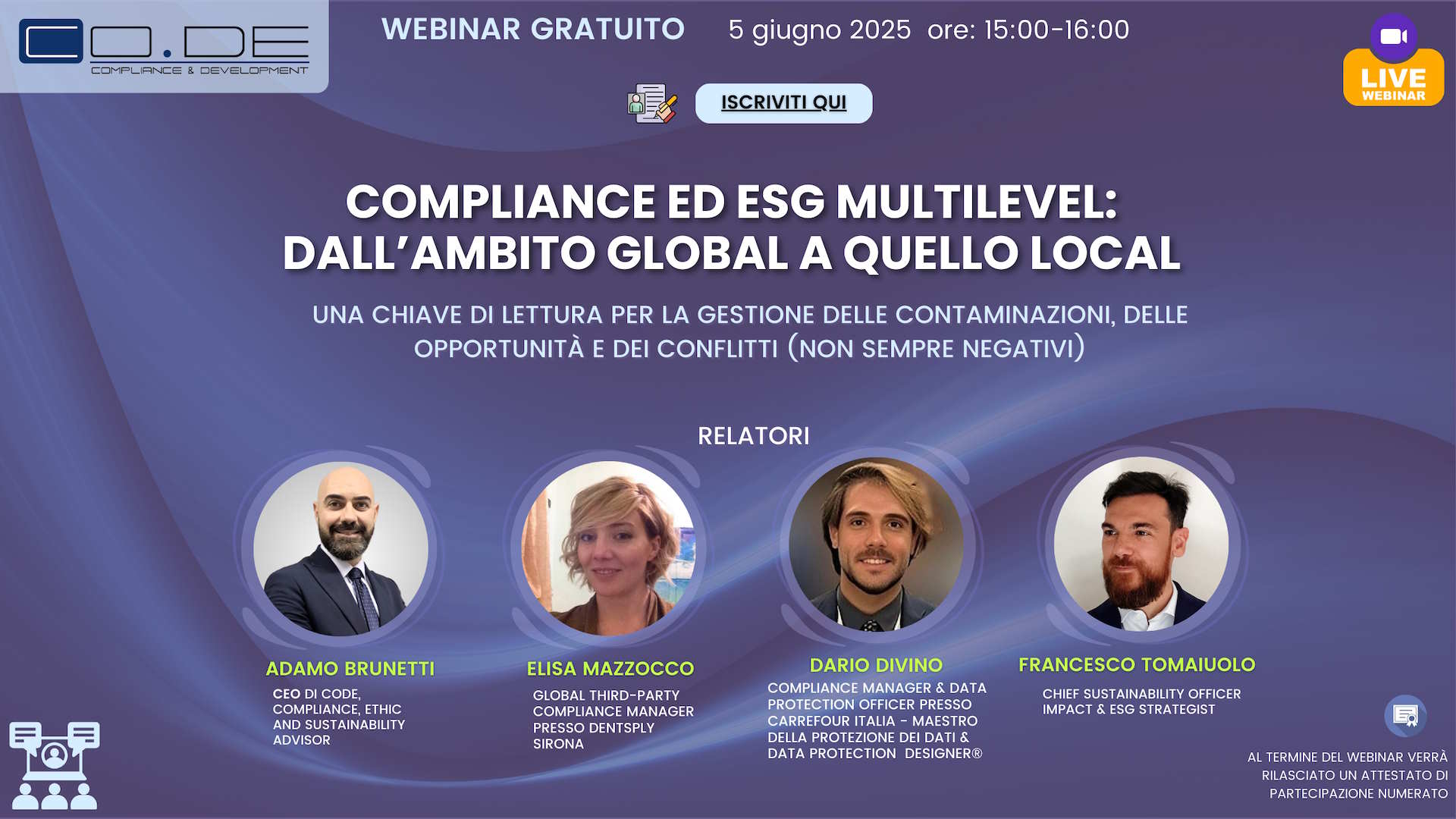 🎙 Webinar GRATUITO: “COMPLIANCE ED ESG MULTILEVEL: DALL’AMBITO GLOBAL A QUELLO LOCAL. Una chiave di lettura per la gestione delle contaminazioni, delle opportunità e dei conflitti (non sempre negativi).”.