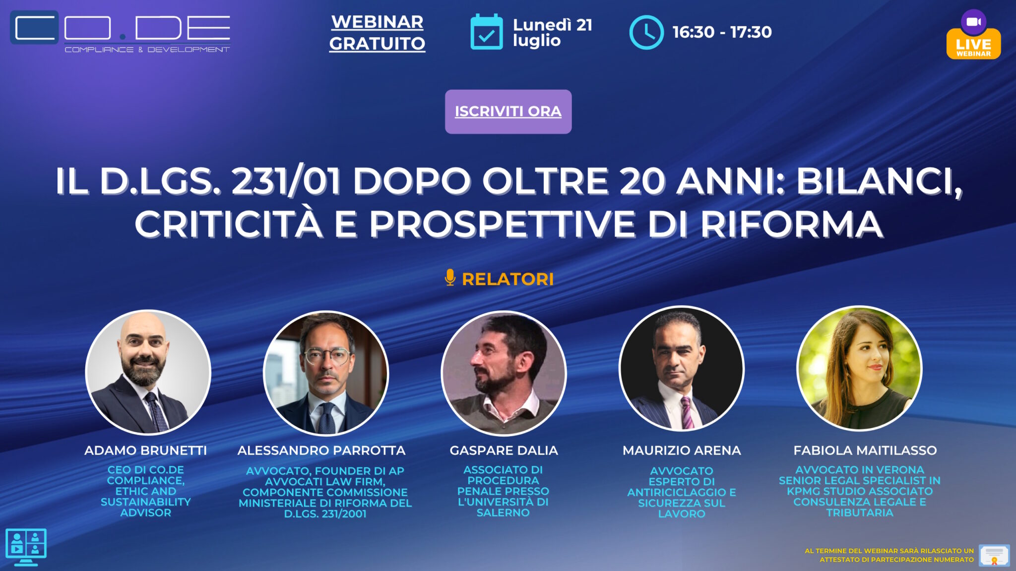 📢 Webinar GRATUITO “Il D.Lgs. 231/01 dopo oltre 20 anni: bilanci, criticità e prospettive di riforma”